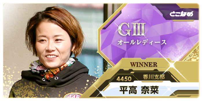 最終日は晴れ。緩いホーム追い風で優勝戦が行われた。枠なりの3対3から⑤三浦がコンマ05のトップスタート。②大瀧らも鋭く0台を踏み込んだ。①平高はコンマ13の6番手。一瞬やや苦しい隊形になったが、1Mまでに盛り返し、③水野の攻めを冷静に封じて逃げ切った。③水野が2着、展開を突いた⑤三浦が3着に入った。
