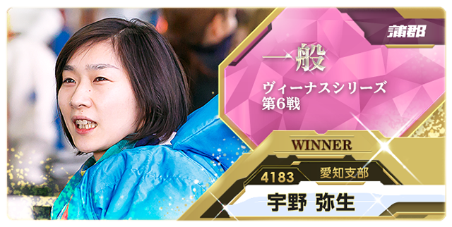 予選は倉持莉々、谷川里江、池田浩美が上位通過した。しかし、この3人の準優1号艇勢は、谷川、池田こそ2着に残ったものの、3連敗。準優11Rで倉持(4着)をまくった宇野が優勝戦1号艇を手に入れた。宇野は準優でコンマ09、優勝戦はさらにギアを上げた02まで突っ込み、蒲郡初優勝をつかんだ。今年の女子賞金は優勝戦終了時点で15位へ浮上した。なお、次走は7月7日からの尼崎ヴィーナスシリーズ戦に出場する予定。