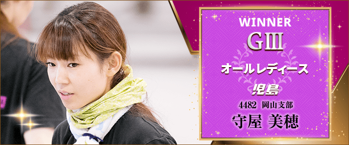 守屋は貴重なシリーズを最高の形で締めくくった。今回は、よもやのA1級勝負駆けだったが、それをクリア。予選を5位通過すると、準優11Rで、2コースまくりに成功。優勝戦は展開に応じた絶妙な差しハンドルを入れ、勝負勘がさえ渡った。地元児島で5回目の優勝を挙げた。女子賞金は3位をキープ。なお、次走は11月12日からのG1丸亀周年に出場する予定。