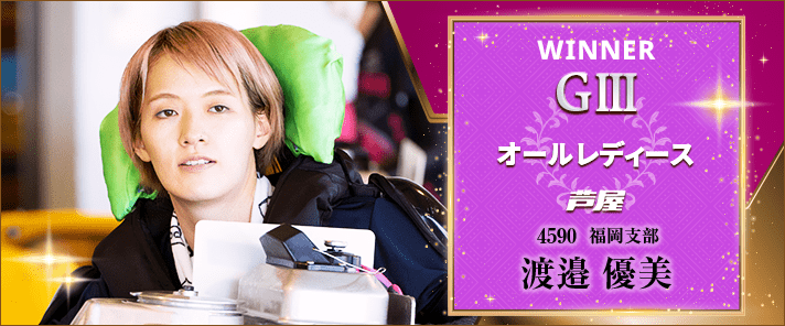 渡邉は初日連勝で勢いに乗り、3日目も連勝。得点率上位を福岡支部勢が占める中、トップを守った。準優12Rはイン快勝。優勝戦は一瞬、危うい隊形にはなったが、慌てず、ミスなく立ち回った。2節連続での芦屋優勝につなげた。なお、次走は12月19日からの福岡男女混合戦、年末には住之江クイーンズクライマックスシリーズに出場する予定。
