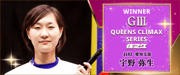 予選は新星の清水愛海、近況充実の清埜翔子が大躍進。その後、大瀧明日香が逆転で予選をトップ通過したものの、準優で敗れるなど、混戦の流れが続いた。優勝戦もコース争いからもつれ、その状況でも的確なスタート力を発揮し、冷静沈着に立ち回った宇野に勝利の女神はほほえんだ。なお、宇野の次走は1月10日からの常滑ダブル優勝シリーズに出場する予定。