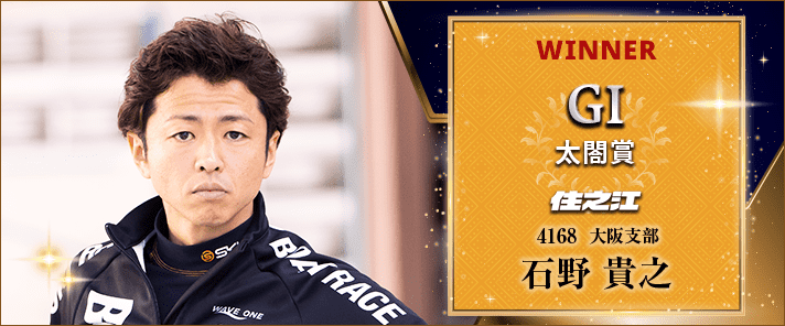 勝った石野は昨年3月のSGボートレースクラシック以来となる記念制覇でG1通算9回目の優勝。これで賞金ランキング6位に浮上し、2年連続9回目のグランプリ出場へ前進した。