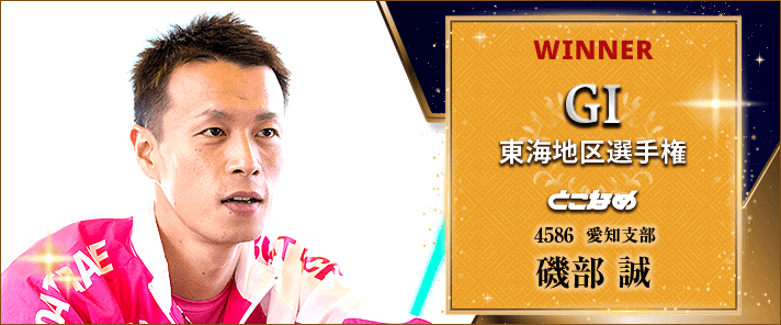 常滑で行われた東海地区選手権。優勝戦の進入は1254/36でスロー勢が深めの起こし位置となった。スタートで踏み込んだのは1号艇の池田浩二。インから先手を奪って1マークを先マイする。しかしプラス01のスリットオーバーで無念のFコール。戦線離脱となった。これにより2コースから差して2番手につけていた磯部誠が繰り上がりで先頭へ。6・2・2・3・1・1・1・1・1着と3日目後半から5連勝をマークして頂点に立ち、地区選初Vを手にした。