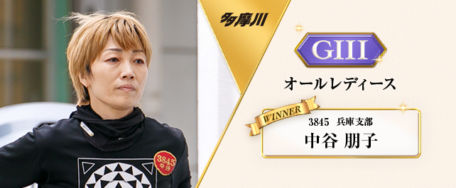 中谷朋子が波乱の展開を見極めた。インから先に回った鎌倉涼がフライング。バック中団だった中谷が、2M巧旋回から先行艇を抜き、首位に抜け出した。2月の平和島オールレディース戦以来、今年2回目、通算26回目の優勝を飾った。多摩川は2回目の優勝となった。