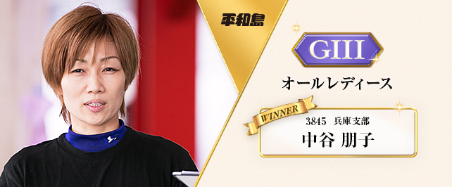 最終日はくもり。終盤にホーム向かい風が強まり、優勝戦は7メートルまで増した。スタートは③加藤がコンマ14のトップタイミング。②塩崎が同34で後手に回った。①中谷には苦しい隊形になりかけたが、コンマ18スタートから力強く伸び返し、1周1Mを丁寧に先マイ。③加藤のまくり差しを封じて的確に持たせた。③加藤が2着。最内を差した⑥角が、道中で④清水を退け、3着に入った。