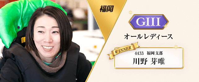 渡邉がシリーズ序盤に3連勝を決めたが、川野が素早く猛追。予選8走を5勝、2着2回、4着1回にまとめた川野が、トップ通過した。迎えた準優12R、優勝戦とも、2番手スタートから巧みに逃げ切った。15年12月のクイーンズクライマックス以来、2回目の福岡優勝にもなった。今年の女子賞金は5位へ浮上。なお、次走は3月18日からの大村男女混合シリーズに出場する予定。