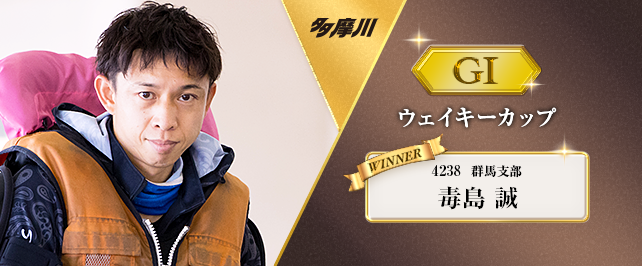 多摩川周年を制したのは毒島誠だ。予選を4・1・1・3・2・2着の2位で通過した毒島は、準優でイン逃げを決めて優出切符を獲得。予選1位の鶴本崇文が準優4着で敗退したことにより、毒島が多摩川周年3大会連続の優勝戦1号艇となった。前回の多摩川周年ではイン戦3着で優勝を逃した毒島だが、今回はインからコンマ09のトップスタートで逃げ切って雪辱。2大会ぶり2回目のウェイキーカップ優勝を果たした。