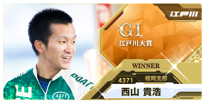 初日が悪天候で中止順延となった江戸川周年。一日遅れの優勝戦を制したのは西山貴浩だった。初日3・3着とまずまずのスタートを切った西山は、2日目にイン逃げで今節初白星を飾ると、3日目には4コースまくり差しと6コース差しで圧巻の2連勝をマーク。予選を3・3・1・1・1・2着でトップ通過する。そして準優はコンマ04、優勝戦はコンマ07とインからトップスタートで逃げ快勝。節間オール3連対で難水面を制圧した。